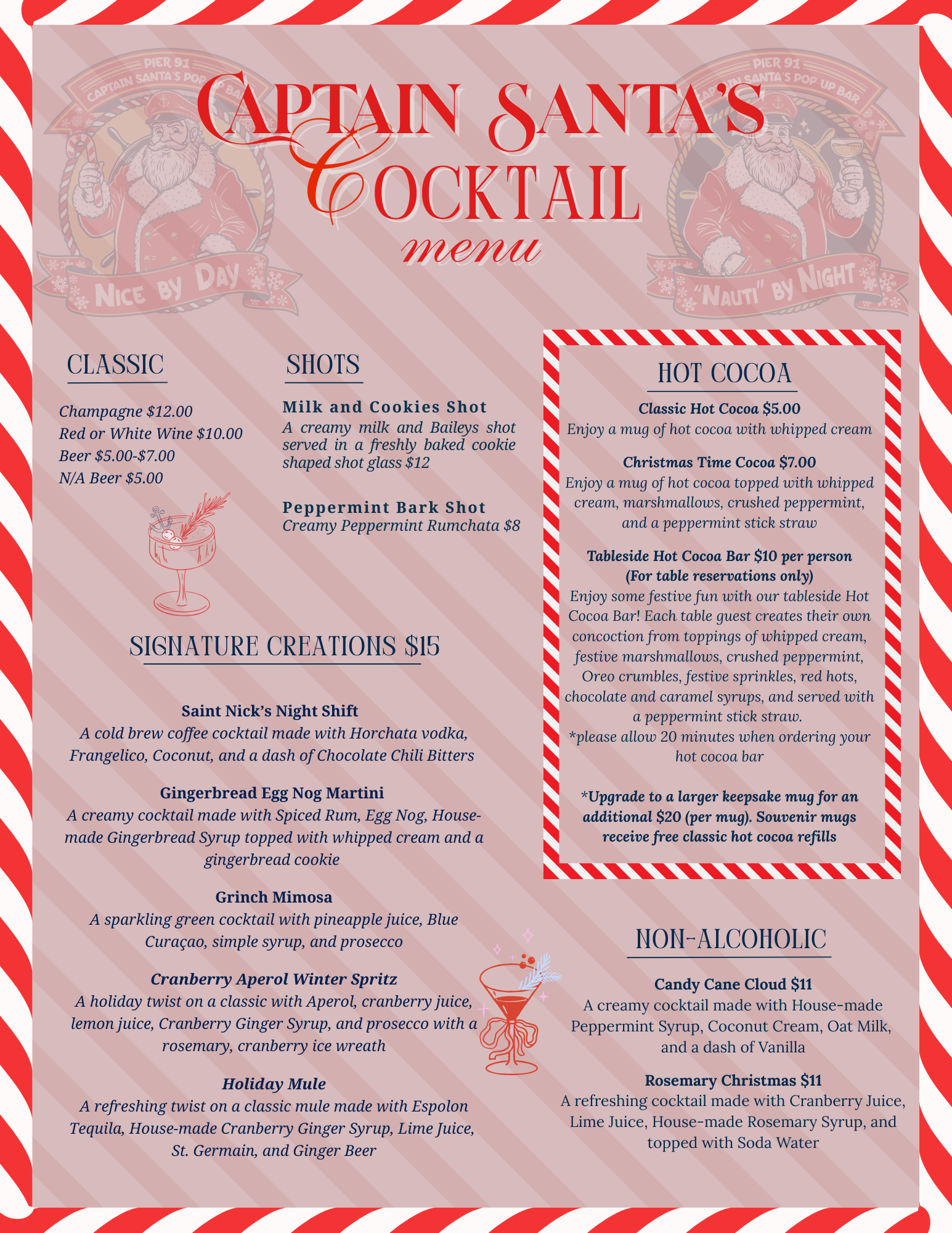 Find the clues hidden inside Captain Santa to access our Secret Speakeasy! Enjoy an exclusive menu of curated cocktails and menu items.